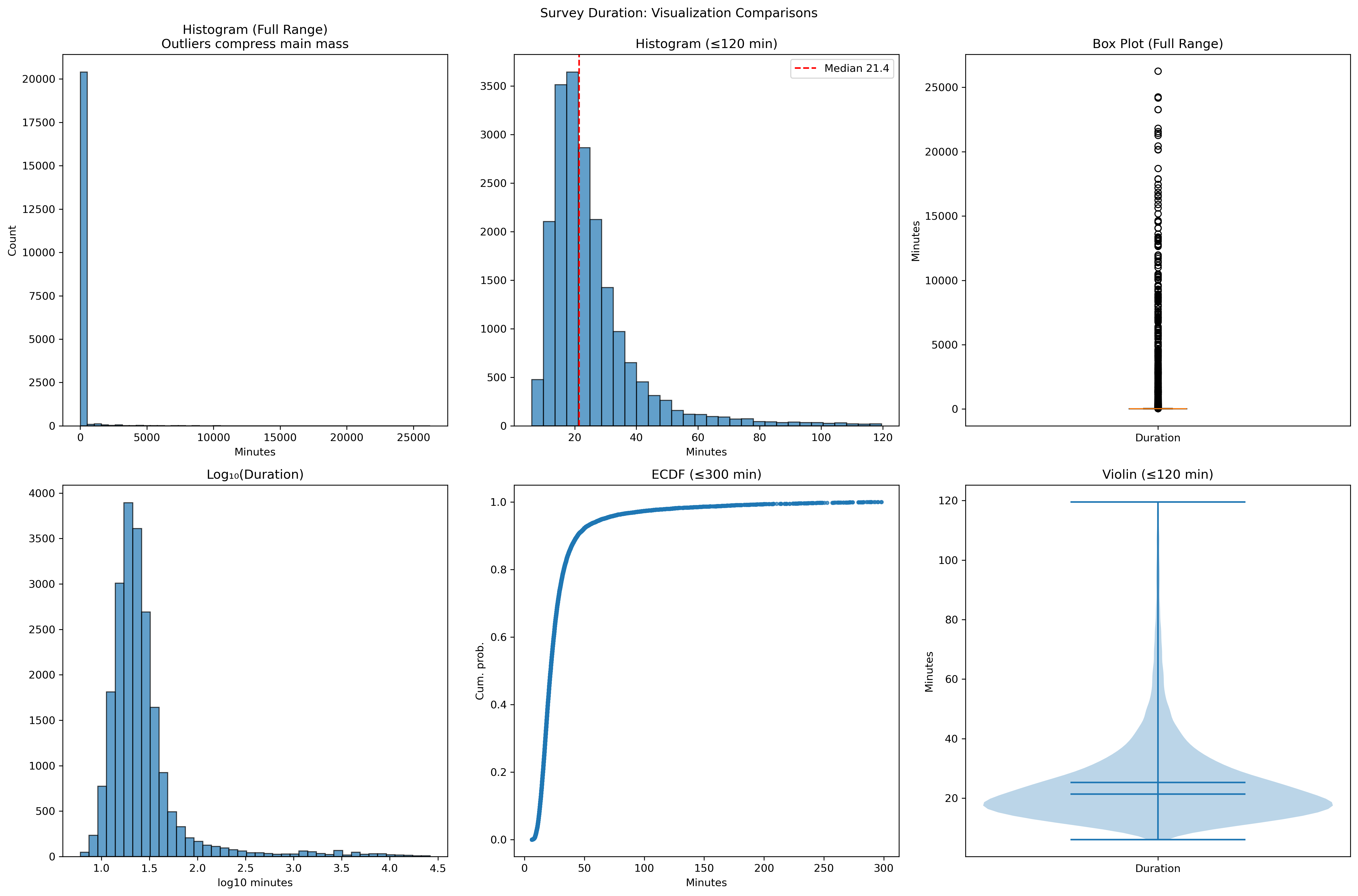 A note on extreme durations: Very long times usually reflect paradata artifacts-tabs left open, laptop sleep, or time-zone parsing-rather than genuine answering behavior. We treat such spikes as artifacts, not respondent traits.