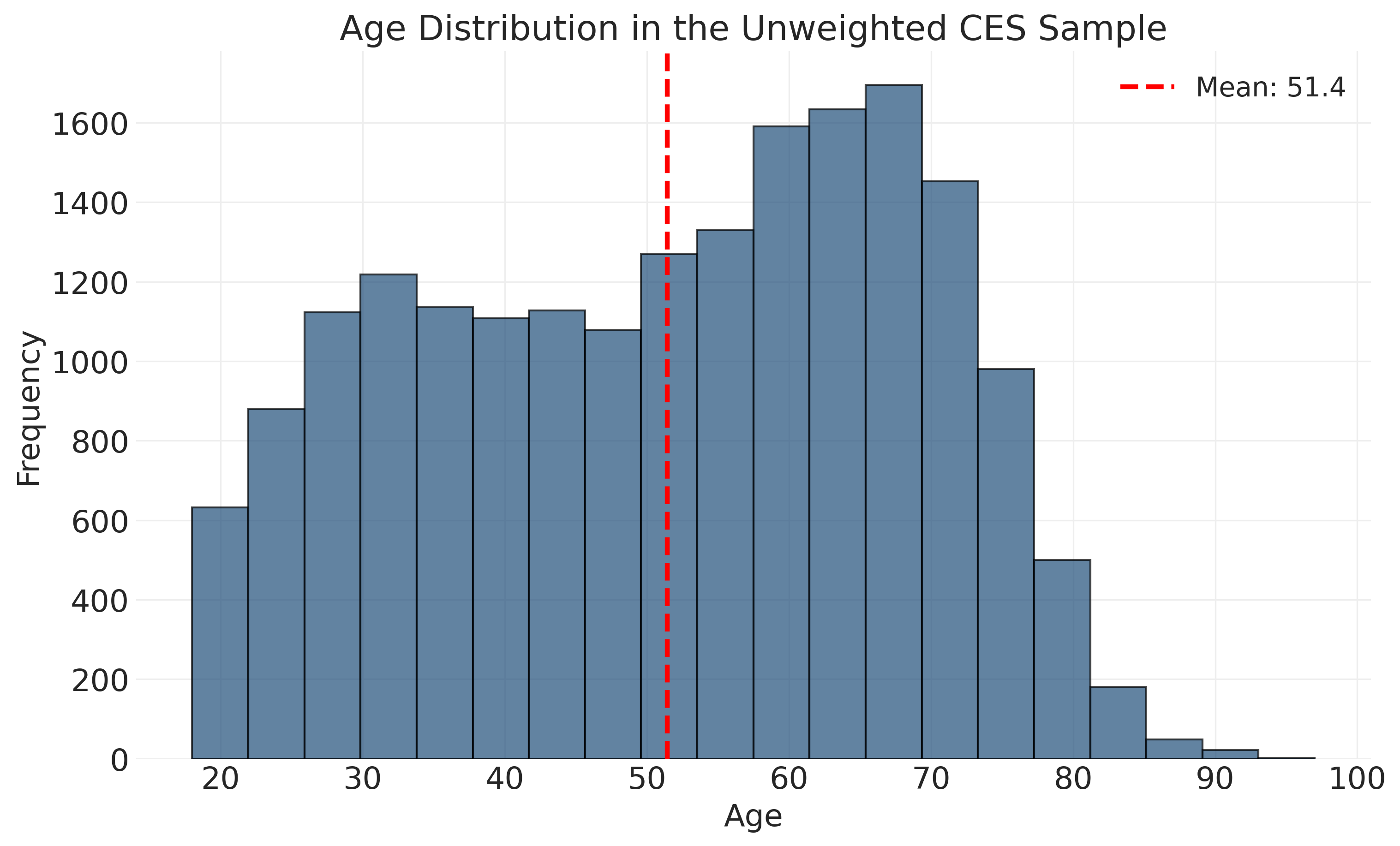 Figure 6.1: Age distribution in the unweighted CES sample shows fairly even representation across ages 30-70, with fewer very young (under 30) and very old (over 70) respondents. This pattern is typical of telephone and online surveys, which tend to under-represent young adults busy with education and early careers, and older adults who may be less comfortable with technology.