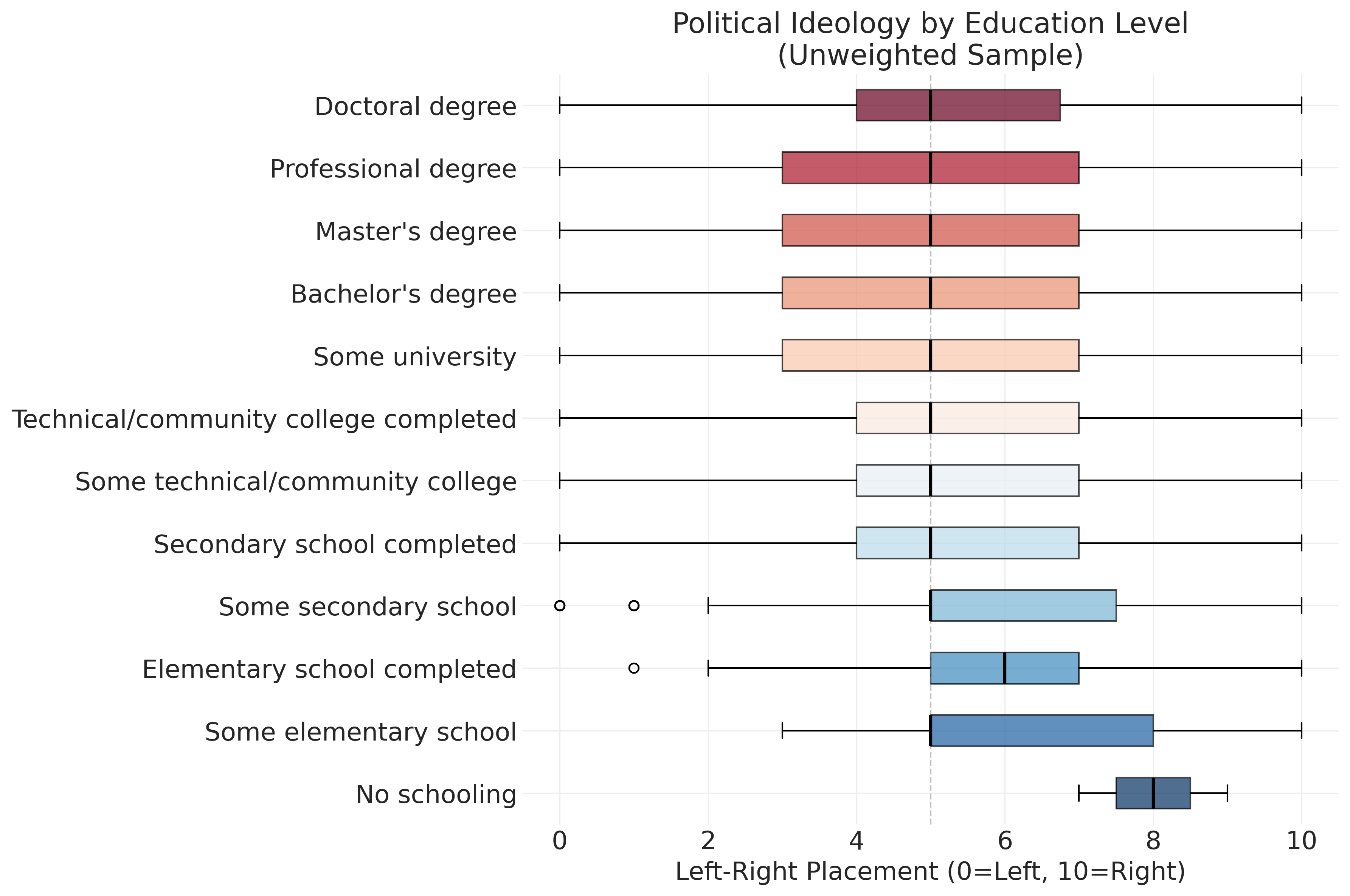 Figure 6.8: Boxplots of left-right self-placement by education level show modest variation in political ideology across education groups. Higher education levels (Bachelor’s, Master’s, Doctoral) show slightly lower median ideology scores (more liberal), while lower education levels show slightly higher scores (more conservative). However, the massive overlap in boxes indicates that education level explains only a small portion of ideological variation—within-group differences dwarf between-group differences.