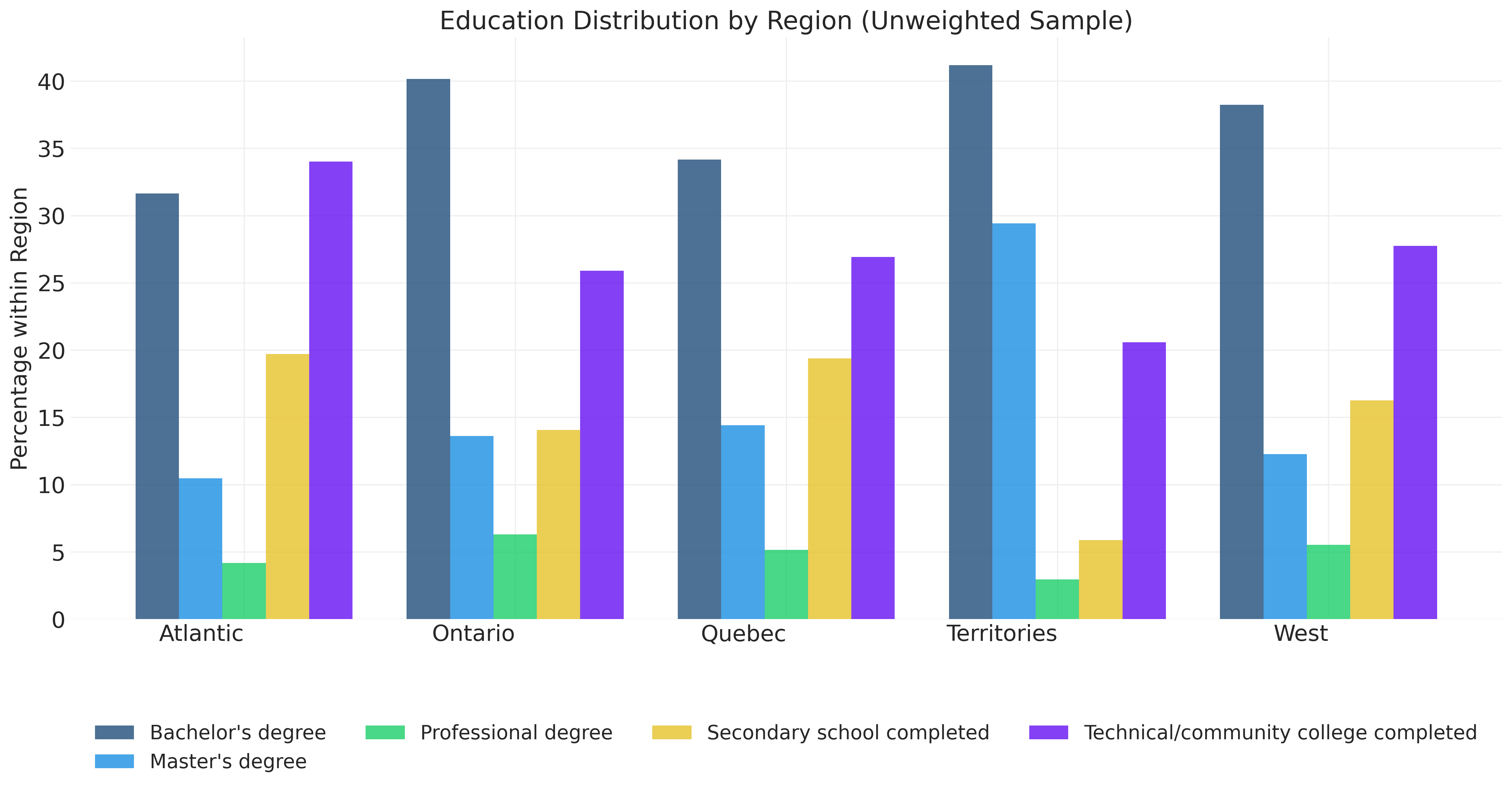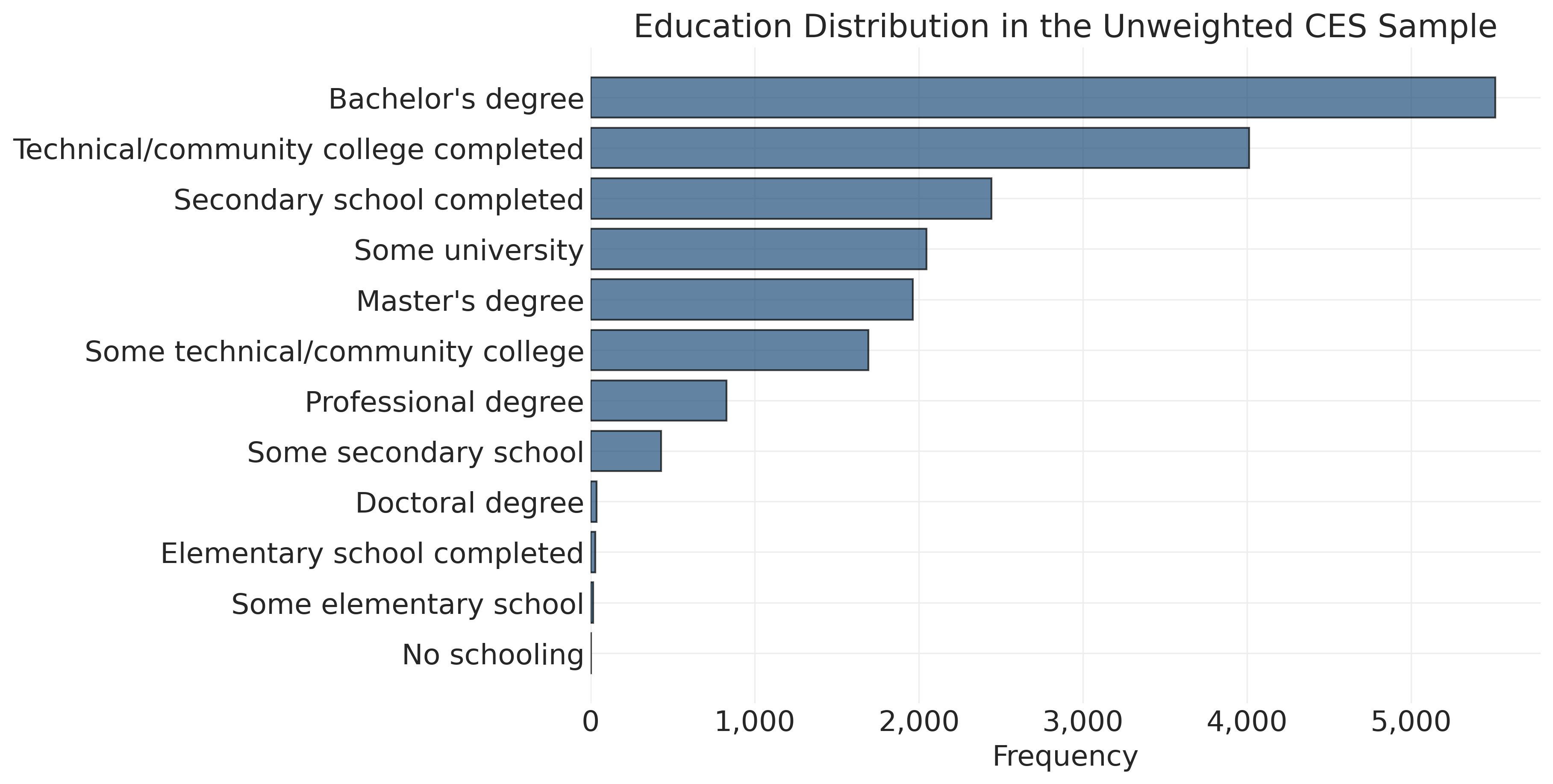 Our analysis sample consists of approximately 20,000 Canadians who completed the CES survey. While this is a large and carefully designed sample, it does not perfectly mirror the Canadian population. The CES includes deliberate oversamples of certain groups, such as residents of smaller provinces, to ensure sufficient representation for regional analysis. Not all types of people respond to surveys at equal rates. Younger, less educated, and politically disengaged Canadians are typically harder to reach and less likely to participate. These design features and response patterns mean that our sample proportions do not directly translate to population estimates.