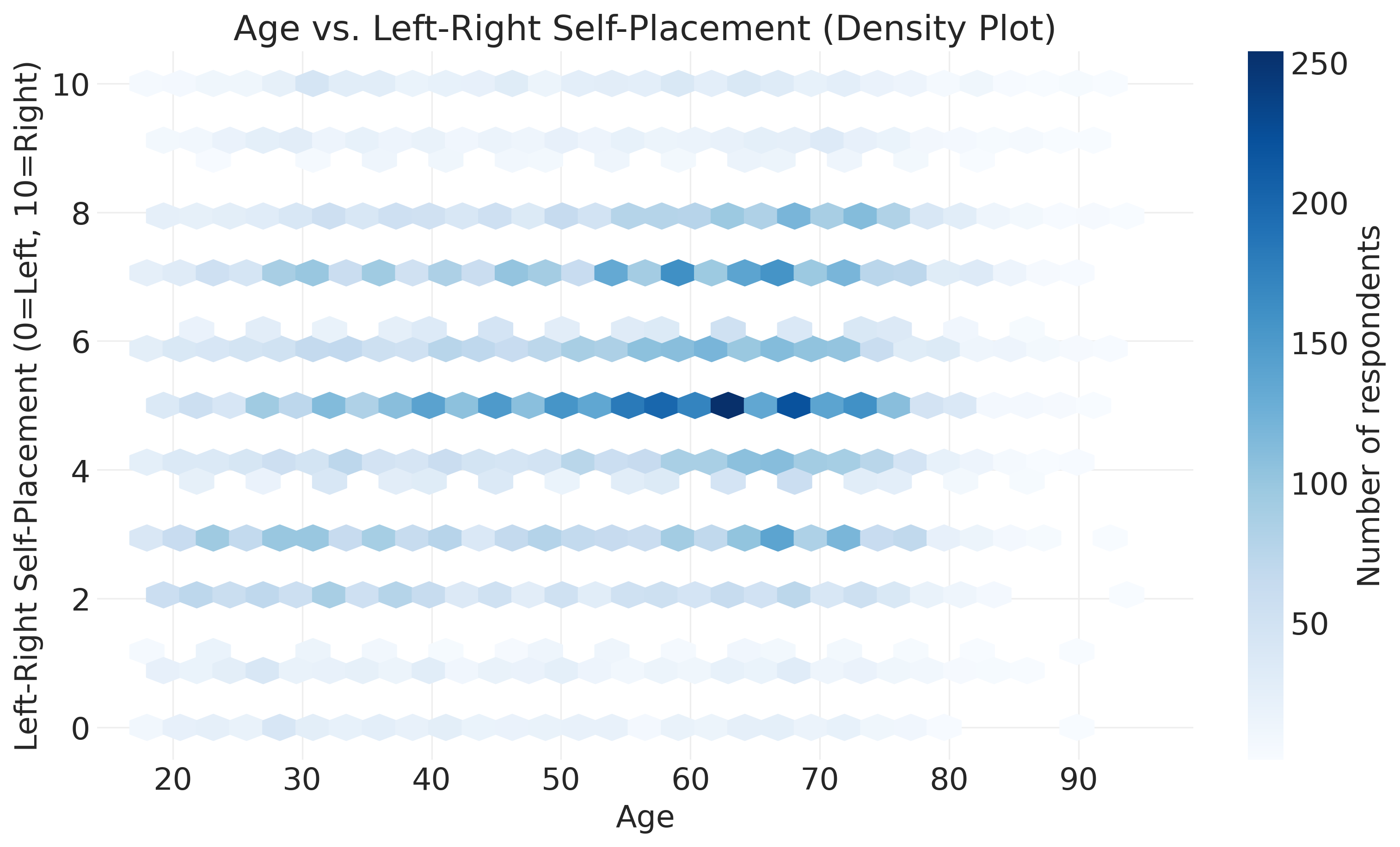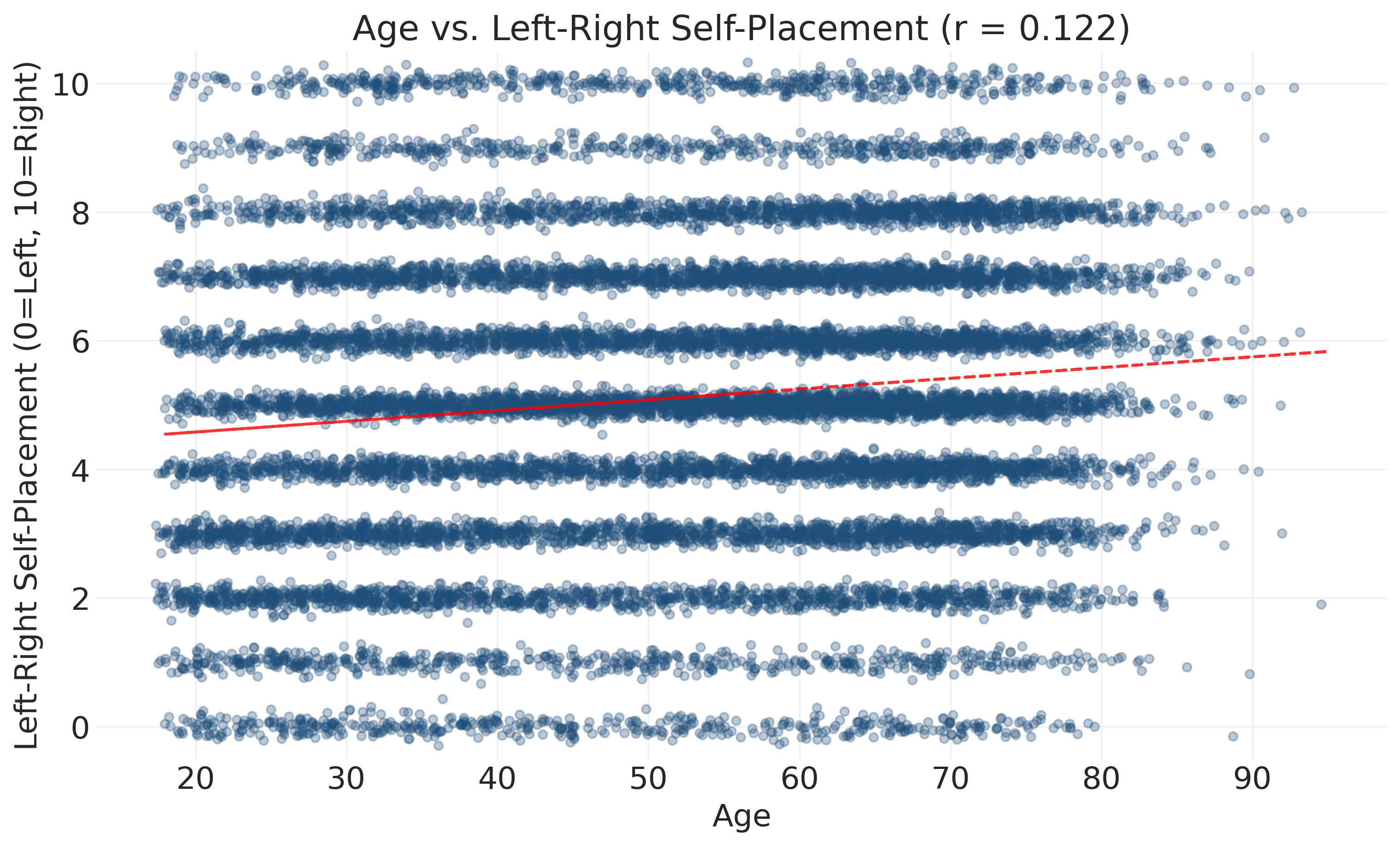 The visualizations we created reveal a relationship between age and political ideology among survey participants. The correlation of 0.125 is weak, meaning age explains only about 1.6% of the variance in ideology (r² = 0.016). Substantively, older respondents tend to place themselves slightly more to the right, but there’s enormous variation at every age. Practically, knowing someone’s age tells you almost nothing about their ideology. We must also exercise caution because this relationship describes survey participants, not the general population. Age-related response bias could influence this pattern.