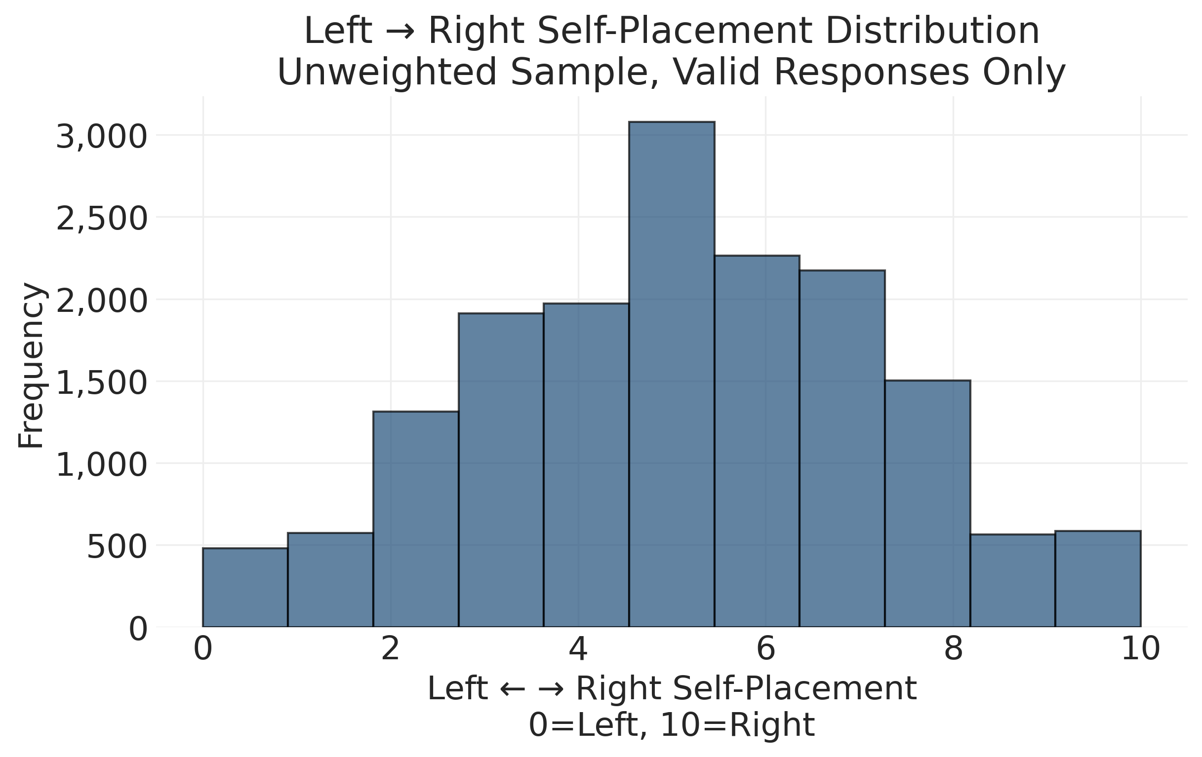When is unweighted sample analysis appropriate? We use unweighted data when exploring data quality and response patterns, when understanding how survey variables relate to each other conceptually, when developing theoretical insights about political attitudes, and when testing whether measurement approaches work as intended. These are all questions about the structure of political attitudes and the quality of our measures, not about precise population proportions.